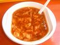 A húst vékony szeletekre vágjuk. Fazékban kevés vizet forralunk, 2 percig elősütjük benne a húst, leszárítjuk szalvétával, félretesszük. A babcsírát 20 percig meleg vízben áztatjuk, majd eltávolítjuk a tövét, s a csírát megszárítva egész vékony szeletekre vágjuk. Az üvegtésztát 5 percre beáztatjuk, megszárítjuk, 12 cm-es darabokra vágjuk, félretesszük. A tojásokat kis edényben 1 kávéskanál szezámolajjal felverjük. Öblös fazékban felforraljuk a húslevest, hozzáadjuk a hússzeleteket, az üvegtésztát, a babcsírát, az ecetet, a fehér borsot és a szójaszószt. 3 percig forraljuk, akkor besűrítjük a vízzel elkevert kukoricaliszttel. Még 2 percig pároljuk, belecsorgatjuk a felvert tojást, és villával vagy pálcikával összetörjük. Hozzáadjuk az újhagymát, a koriandert, a szezámolajat, meg a chiliolajat. forrón tálaljuk.